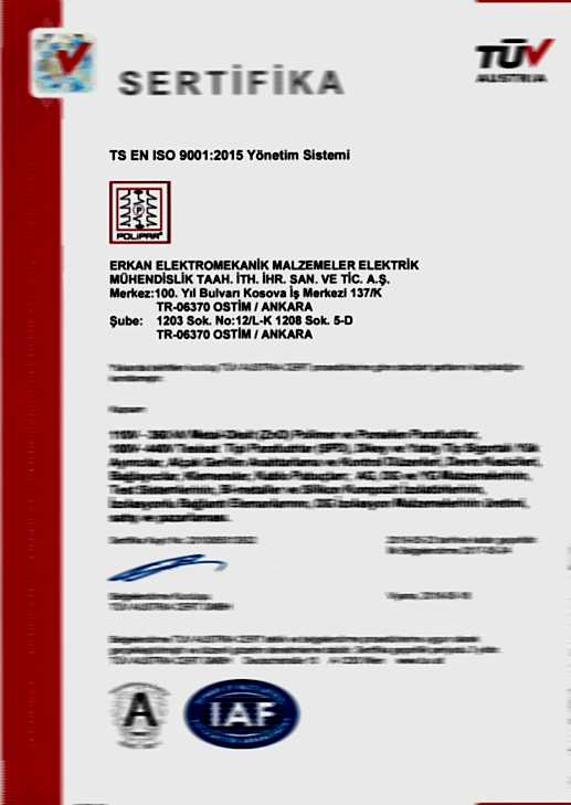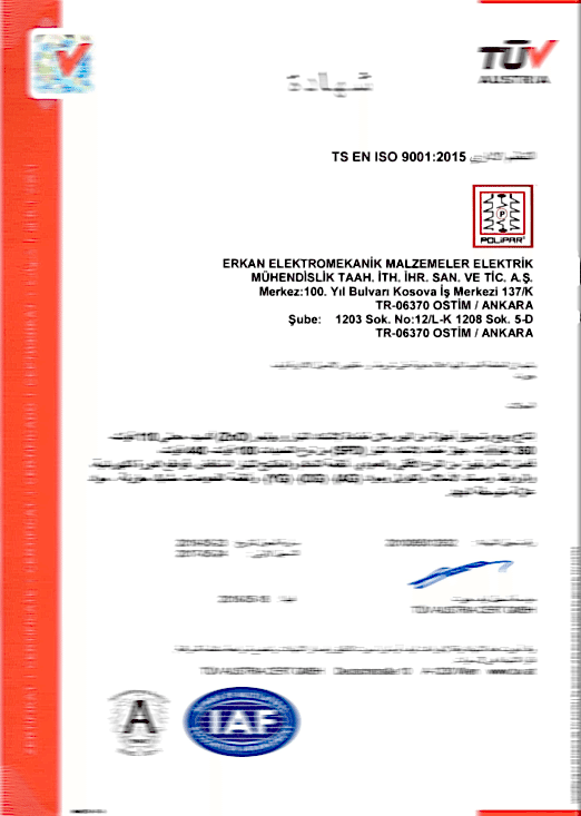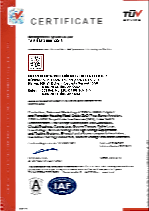 Surge arresters in accordance with TS-EN 60099-4, IEC 99-4, IEC 60, IEC 270 and IEC TC 37 standards within the TSE and ISO 9001 Quality Management System, our polymer (composite) chain insulators IEC 61109 and IEC 62217 In accordance with the standards, our installation type products are manufactured in accordance with TS EN 61643-11. In addition, our connector lugs and terminals are certified with TS EN 61238-1 standard. In this way, our company is based on both domestic and international standards in production norms.